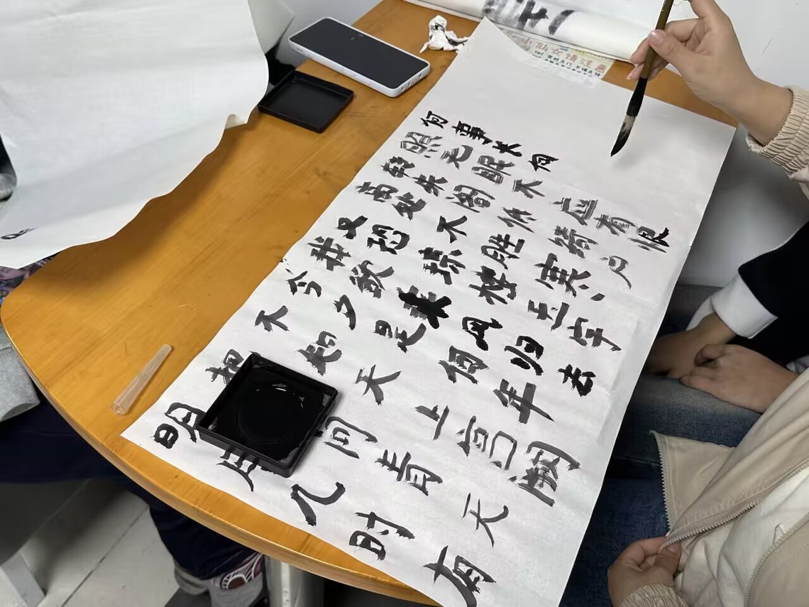 活动在“诗诵中秋·声动明月”中拉开帷幕。各族学子同台演绎,或独诵或合诵,深情吟咏《水调歌头·明月几时有》等经典诗词。当“但愿人长久,千里共婵娟”的韵律在会场回荡时,传递的不仅是团圆期盼,更是中华儿女共同的文化记忆与情感认同。“灯谜猜字·智趣共赏”环节妙趣横生。悬挂的中秋灯谜盲盒涵盖诗词典故,吸引各族学子与社区居民热情参与。大家围聚一堂,在破解谜题中交流智慧,在欢声笑语中增进情谊,现场气氛热烈融洽。“执笔书情·墨韵中秋”将活动推向高潮。备齐的兼毫、墨碟与宣纸让参与者尽情挥毫,不同民族背景的学子共同执笔,或临摹经典诗句,或书写佳节祝福。笔墨流转间,展现的是汉字书法的独特神韵,凝聚的是对中华文化的深切认同。